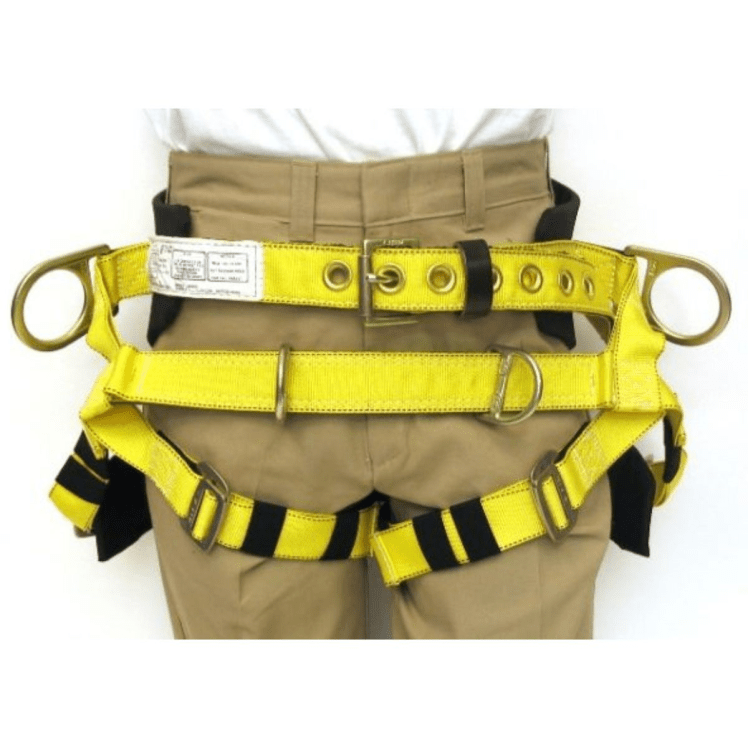 The padded seat band has an aluminium bar reinforcement. The 4 inch seat band has adjustors on each side and padded leg straps with mating buckles. 1 3/4 inch waist belt has a tongue buckle and 7 1/2 inch padded back pad. The belt is equipped with 3 tool loops on the back and 2 brass tool snaphooks, one on each hip.